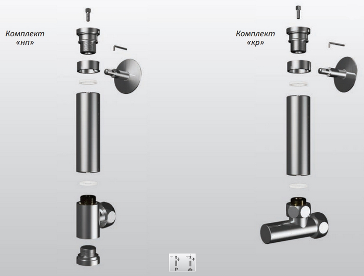 Комплектация - кран "Маевского" (2 шт.), уголок (2 шт.), телескопический держатель (2 шт.), декоративный колпачок (2 шт.)