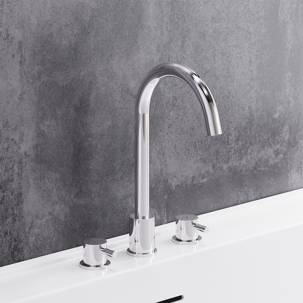 Смеситель для раковины состоит из трех секций: температура воды регулируется отдельными ручками независимо друг от друга как на ретро смесителях. Ручки в виде стика станут ярким акцентом и привнесут особую эстетику в интерьер ванной комнаты.