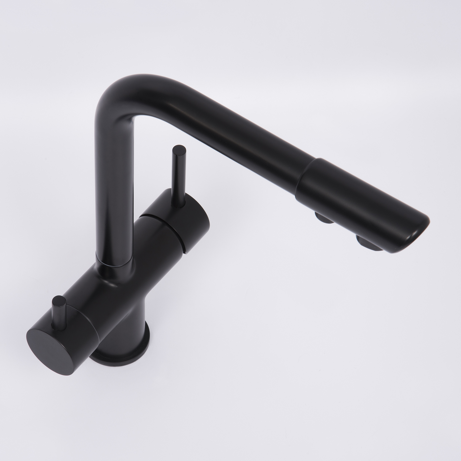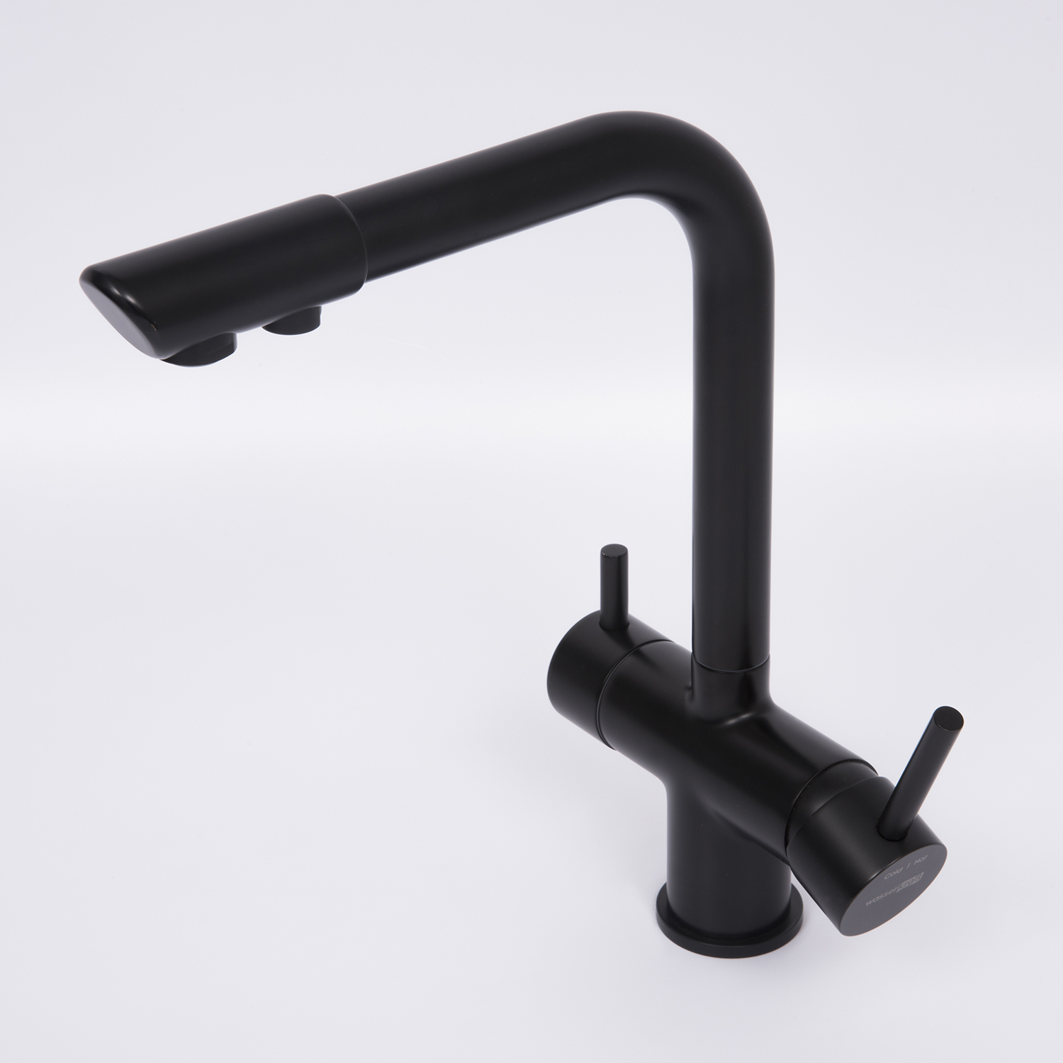 Смеситель с возможностью подключения любого стандартного фильтра для очистки воды. Регулировка подачи очищенной питьевой воды осуществляется с помощью поворота ручки смесителя. Смесители под фильтр подают как обычную водопроводную, так и питьевую воду. С помощью поворота правой ручки смесителя вы регулируете подачу водопроводной воды и ее температуру. При этом поток воды поступает из одного отверстия на изливе смесителя. Чтобы включить подачу очищенной питьевой воды из другого отверстия на изливе смесителя, необходимо повернуть левую ручку изделия. При этом ручка регулирования подачи водопроводной воды должна находиться в закрытом состоянии. Это необходимо для удобного использования питьевой воды. Подача водопроводной и питьевой воды подключаются независимо друг от друга, то есть поток воды может одновременно поступать из двух отверстий смесителя.