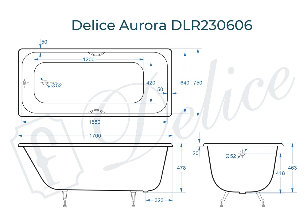Для установки используются фирменные ножки Delice, которые имеют надежное и прочное крепление, обеспечивают высокую устойчивость ванны и регулируются по высоте. Высота на ножках варьируется от 60.8 до 65.8 см. Ножки выполнены из высокопрочного чугуна марки СЧ25, который выдерживает большие нагрузки. Для модели Aurora подходит свой комплект ножек - артикул DLR000012.