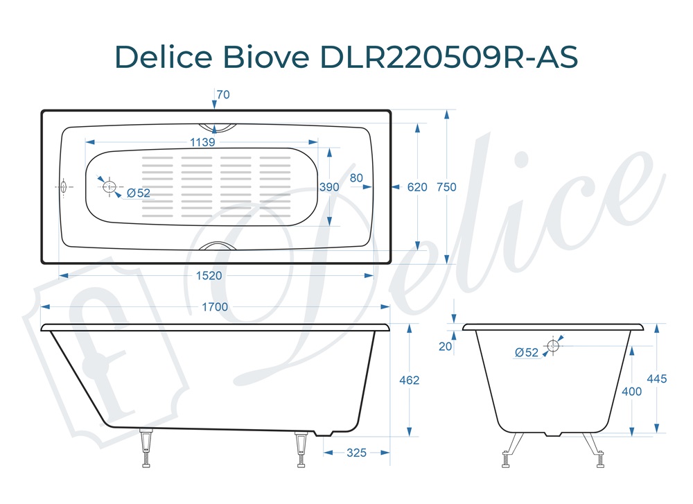 Размерный ряд чугунной ванны Delice Biove: 170х75 см.