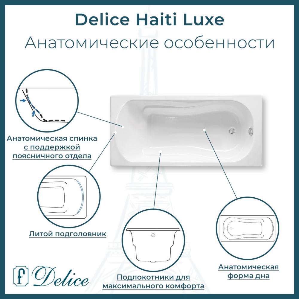 Для установки используются фирменные ножки Delice, которые имеют надежное и прочное крепление, обеспечивают высокую устойчивость ванны и регулируются по высоте. Высота на ножках варьируется от 51 до 59 см. Ножки выполнены из высокопрочного чугуна марки СЧ25, который выдерживает большие нагрузки. С помощью регулировки можно нивелировать геометрические отклонения пола, стен и углов в ванной комнате. Для модели Haiti Luxe подходит комплект ножек для серии Elite - артикул DLR000002.