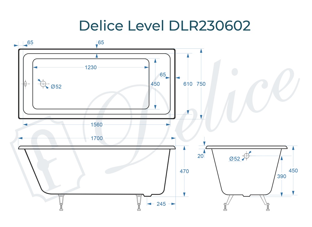Для установки используются фирменные ножки Delice, которые имеют надежное и прочное крепление, обеспечивают высокую устойчивость ванны и регулируются по высоте. Высота на ножках варьируется от 58 до 62.5 см. Ножки выполнены из высокопрочного чугуна марки СЧ25, который выдерживает большие нагрузки. С помощью регулировки можно нивелировать геометрические отклонения пола, стен и углов в ванной комнате. Для модели Level подходит комплект ножек для серии Elite - артикул DLR000002.