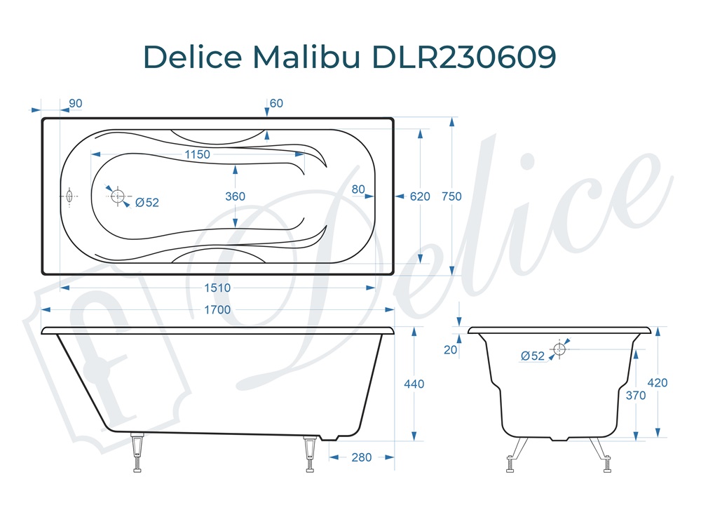 Для установки используются фирменные ножки Delice, которые имеют надежное и прочное крепление, обеспечивают высокую устойчивость ванны и регулируются по высоте. Высота на ножках варьируется от 55 до 59.5 см. Ножки выполнены из высокопрочного чугуна марки СЧ25, который выдерживает большие нагрузки. С помощью регулировки можно нивелировать геометрические отклонения пола, стен и углов в ванной комнате. Для модели Malibu подходит комплект ножек для серии Elite - артикул DLR000002.