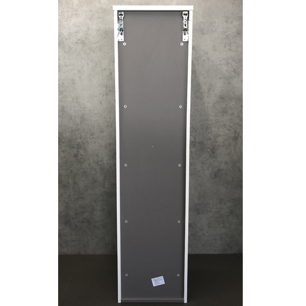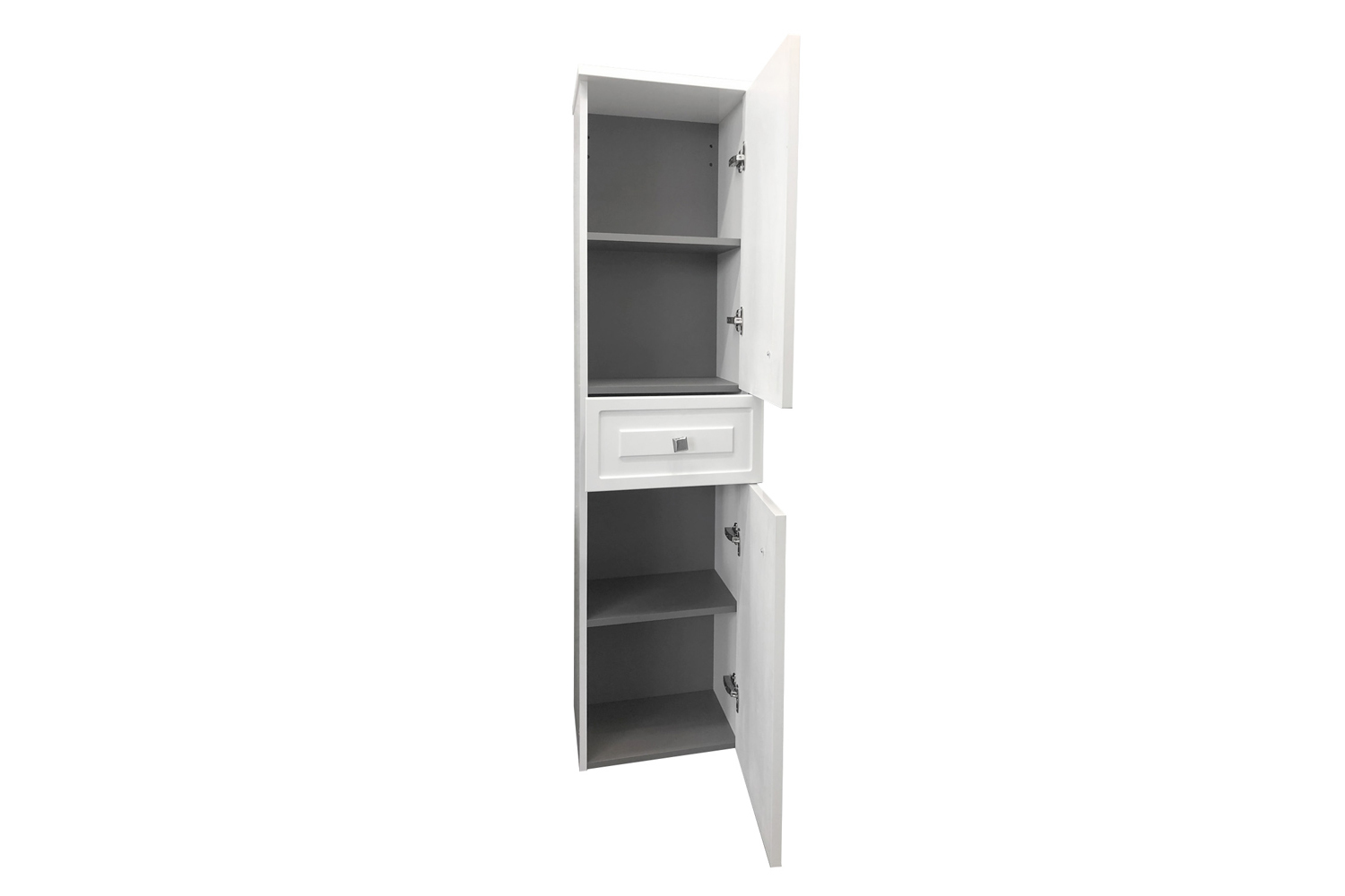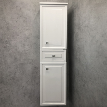 Подвесная шкаф-колонна в неоклассическом стиле. Оригинальные квадратные ручки кнопки. Верхняя, нижняя створки и ящик оснащены системой плавного закрывания. Фасады покрыты белой глянцевой эмалью. За каждой створкой по одной горизонтальной полке. Шкаф-колонна универсальна, может быть подвешена в правом и левом варианте.