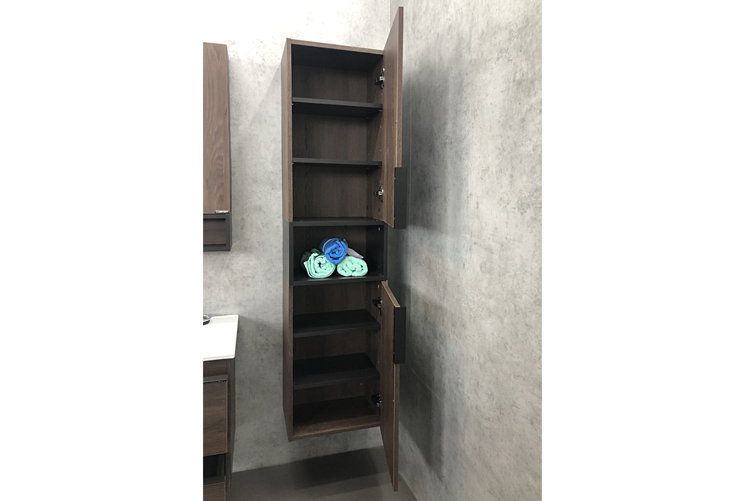Подвесная шкаф колонна с двумя створками и пространством для открытого хранения. Створки оснащены петлями с плавным закрыванием и черными матовыми алюминиевыми ручками. За створками по две регулируемые по высоте полки. Шкаф-колонна универсальна, может быть подвешена переворачиванием в правом и левом варианте.