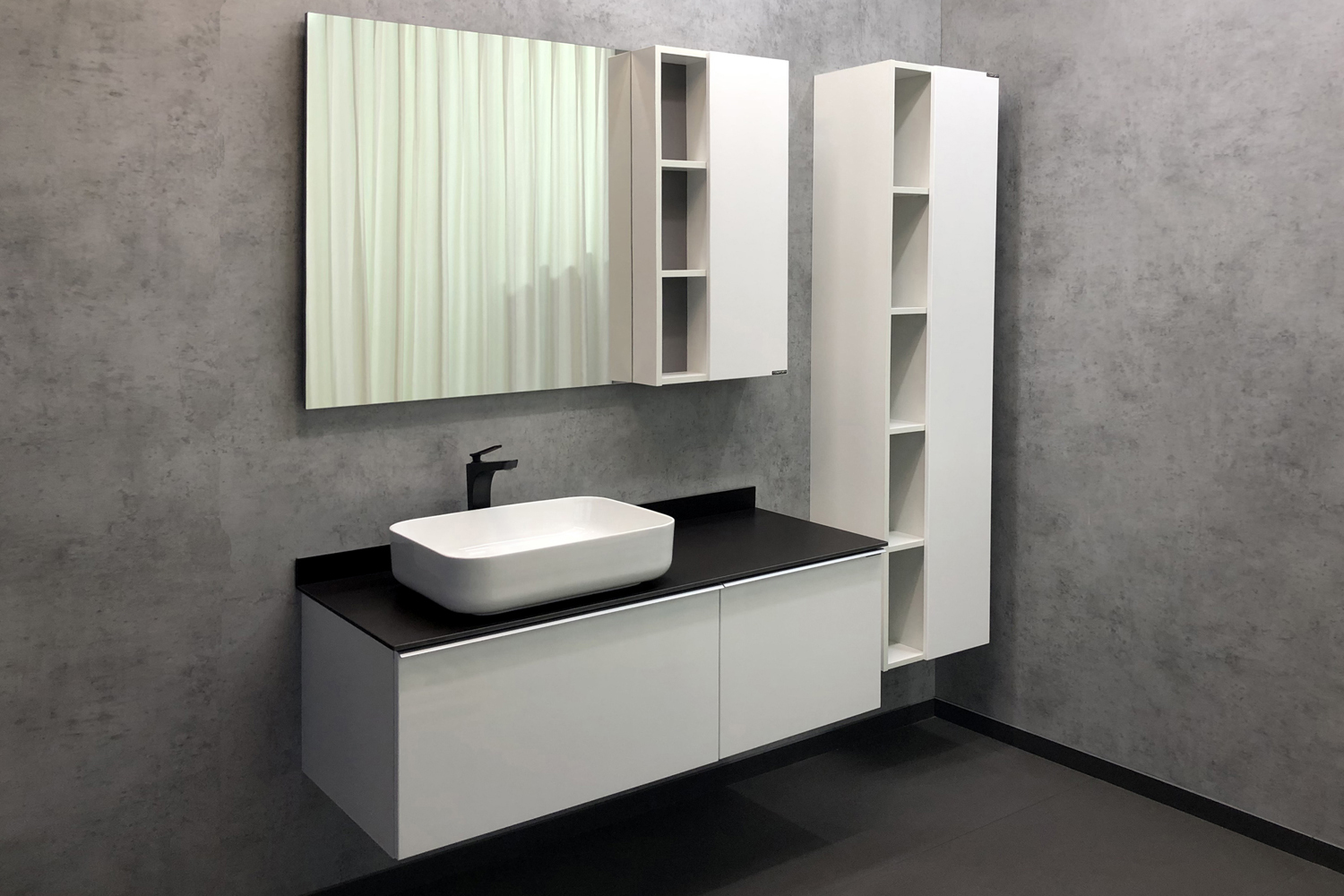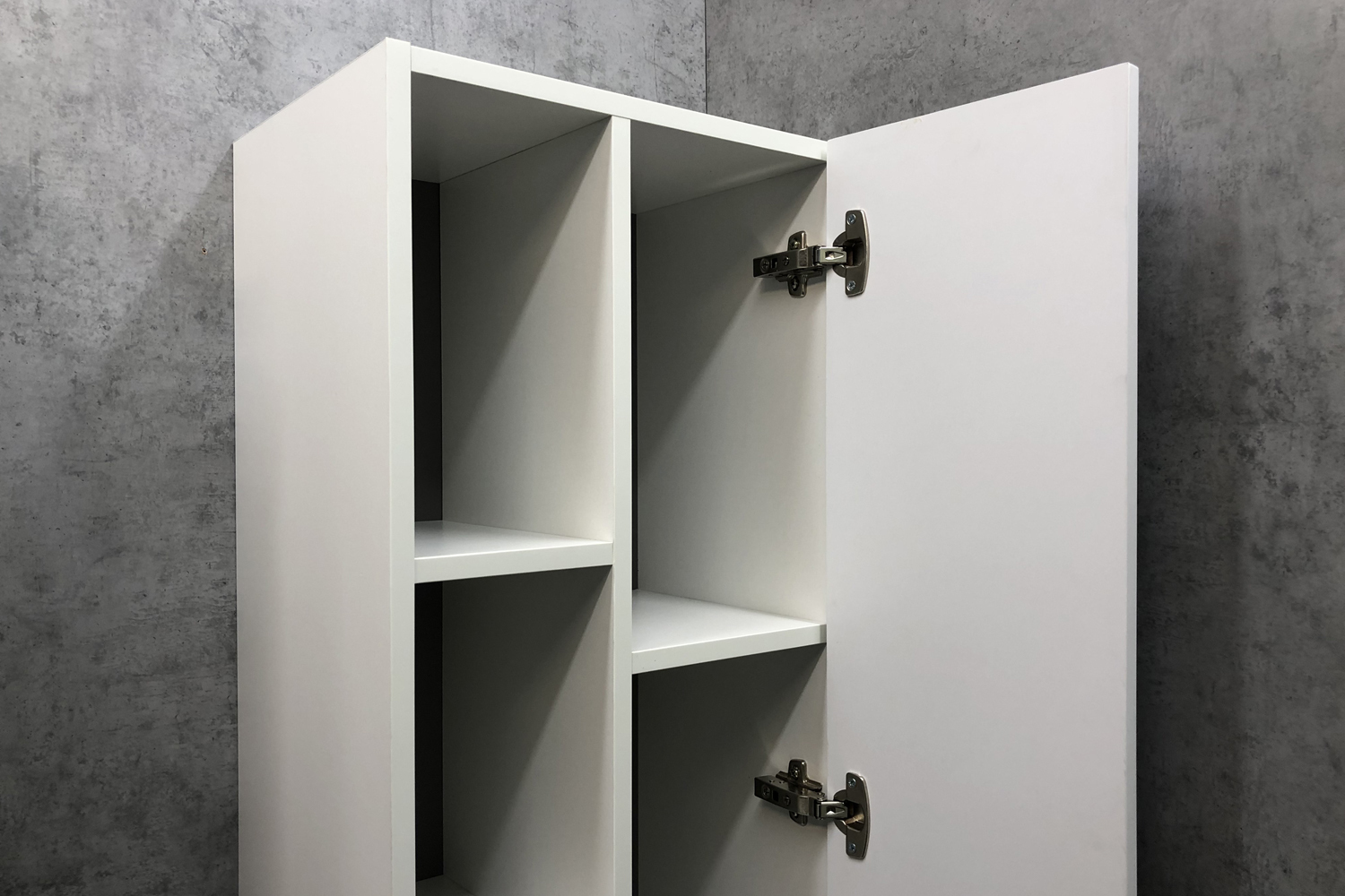 Подвесная шкаф-колонна с одной распашной дверью и пространством для открытого хранения. Створка оборудована петлями с системой плавного закрывания. За створкой три горизонтальные полки.