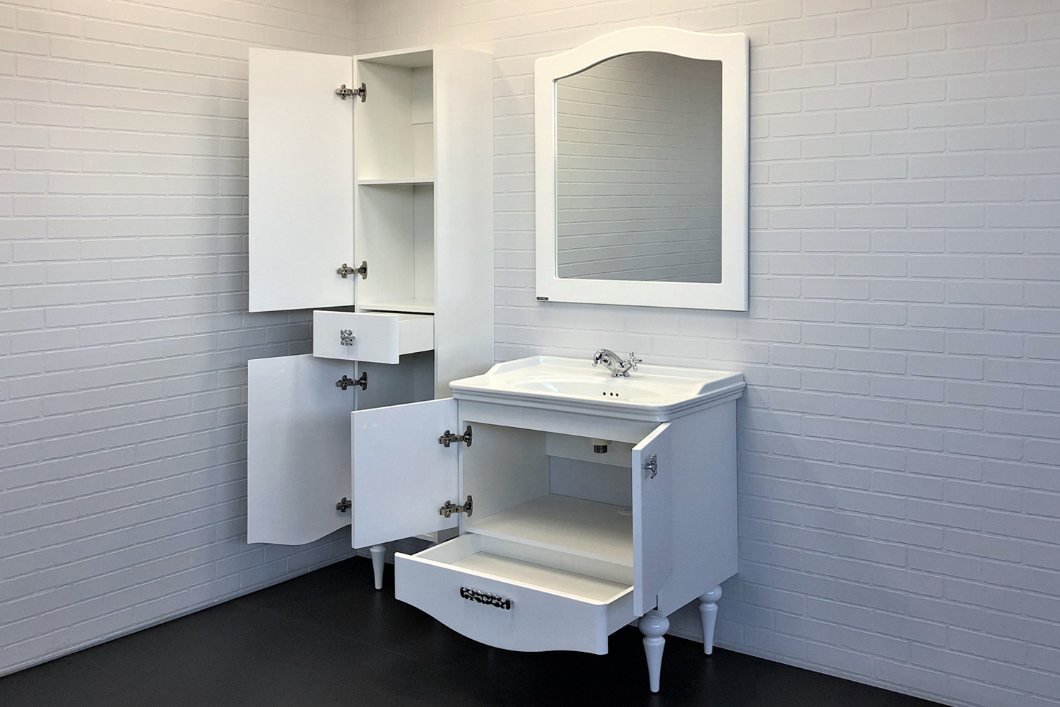 Верхняя, нижняя створки и ящик оснащены системой плавного закрывания. Фасады покрыты белой глянцевой эмалью. За каждой створкой по одной горизонтальной полке