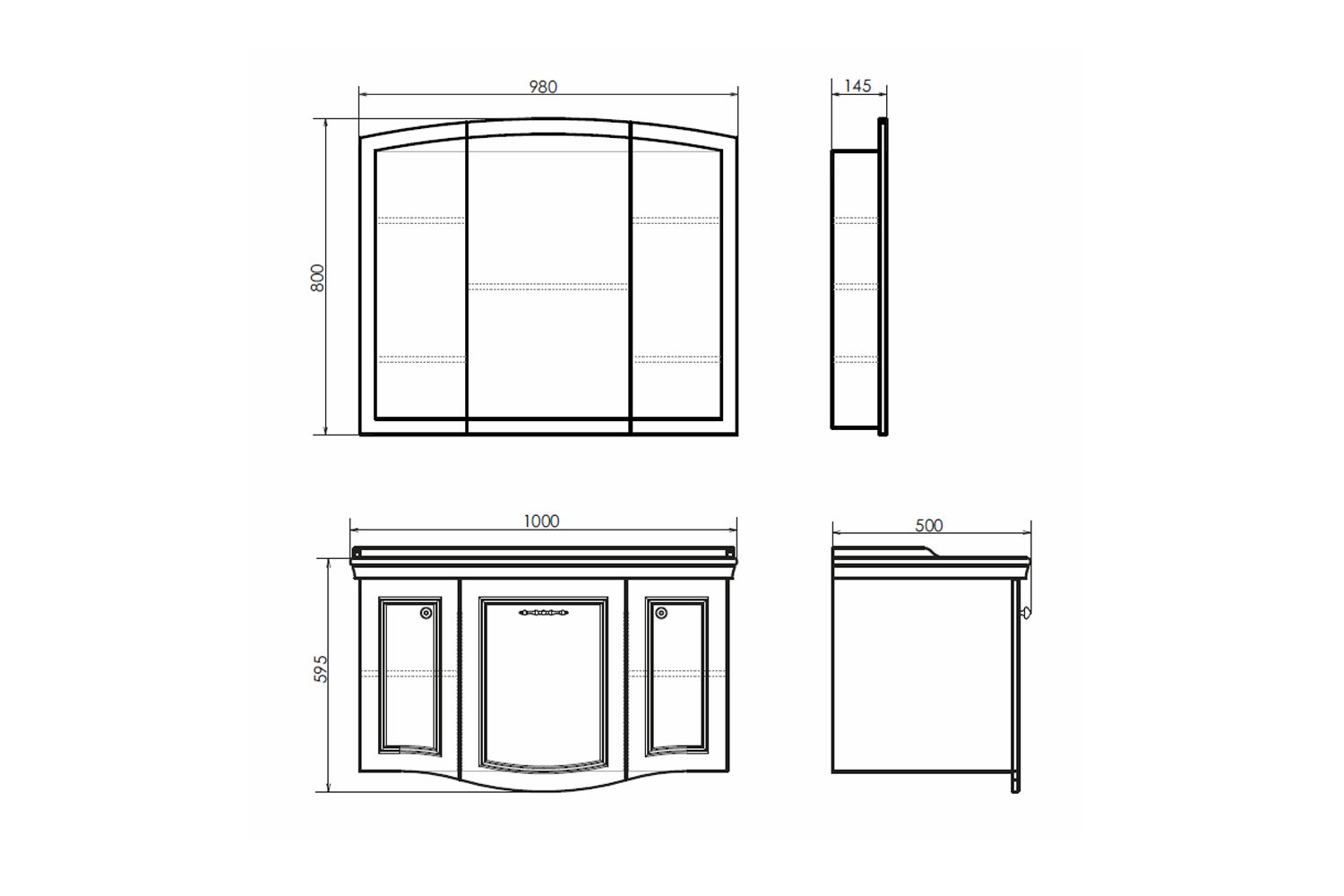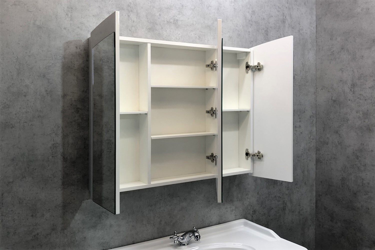 Зеркальное высококачественное полотно с амальгамой на основе серебра. Все три зеркальные створки оснащены петлями с плавным закрыванием. За малыми створками по две полки, за большой - одна горизонтальная полка.