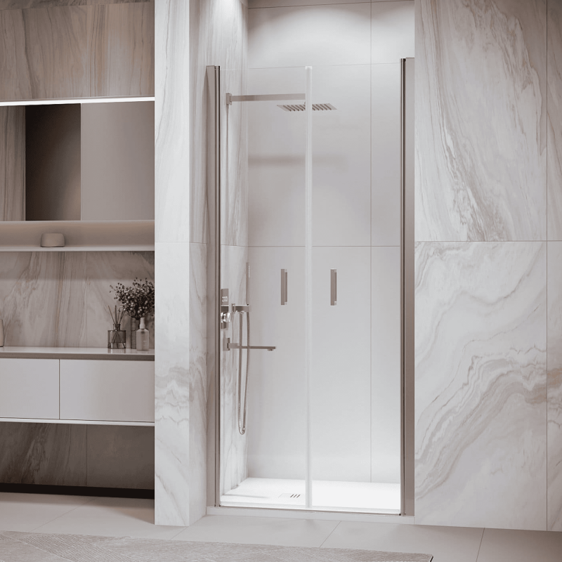 Двух створчатая маятниковая душевая дверь PA-104 с механизмом "Gravity Loop" представлена в популярных цветовых решениях: хром, черный и золото brush.