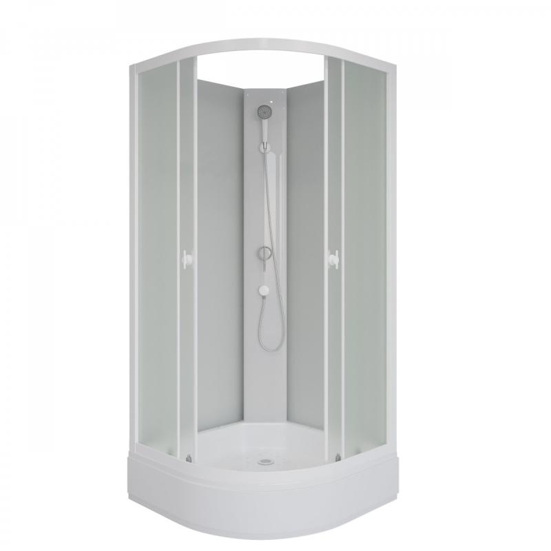 полукруглый низкий (26 см) поддон, ручной душ, смеситель с регулятором режимов, душевая лейка, задние стенки - матовое закаленное стекло 4 мм, двери - матовое закаленное стекло толщиной 4 мм, алюминиевый профиль белого цвета, габариты 100*100*200 см