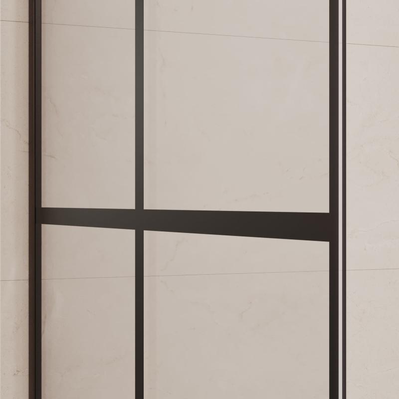 Толщина стекла составляет 8 мм, что обеспечивает высокую прочность и гарантирует безопасность использования. Исполнение стекла прозрачное с рисунком, который нанесён методом шелкографии. Пристенный профиль перегородки выполнен из качественного анодированного алюминия и имеет черный цвет, что отлично сочетается с большинством интерьеров.