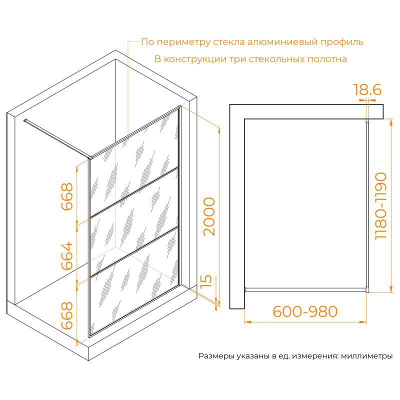 Душевая перегородка состоит из 3-х стекольных полотен (8мм), которые обрамлены изящным анодированным алюминиевым профилем!