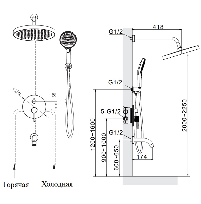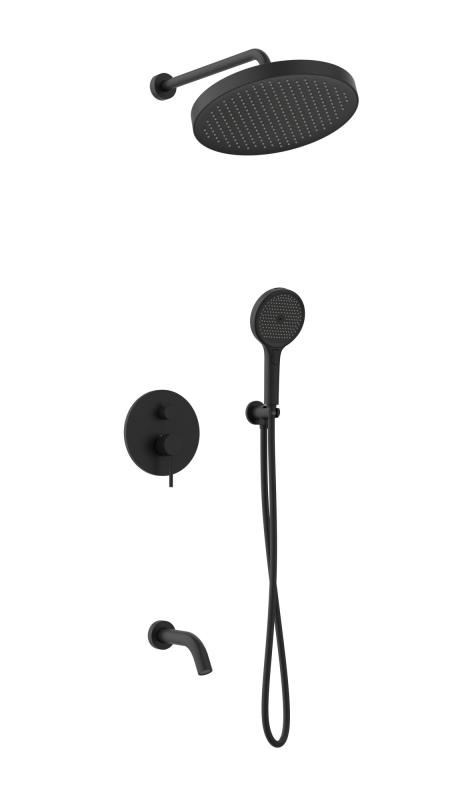 - Комплектация: встраиваемая часть, смеситель с трехпозиционным переключением, излив, штуцер/держатель ручного душа, ручной душ, гибкий полимерный шланг, верхний душ, кронштейн держатель для верхнего душа, отражатели, установочный комплект.