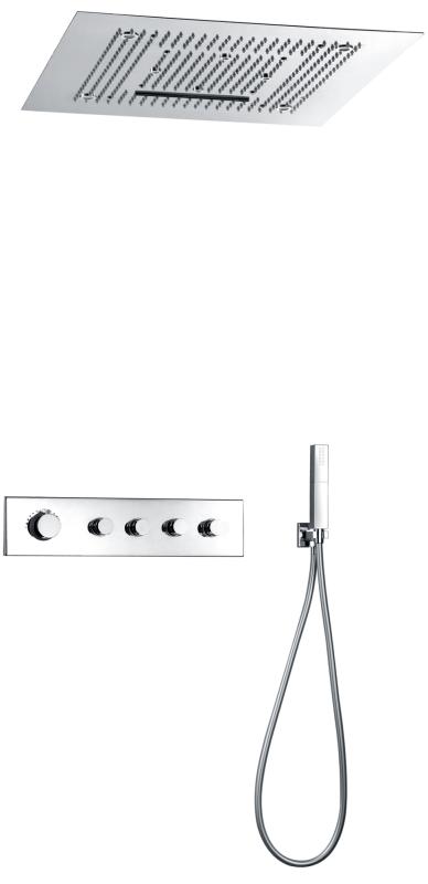 - Комплектация: встраиваемая часть, термостатический смеситель , штуцер/держатель ручного душа, латунный двухрежимный ручной душ, гибкий полимерный шланг, латунный мультифункциональный верхний душ, установочный комплект