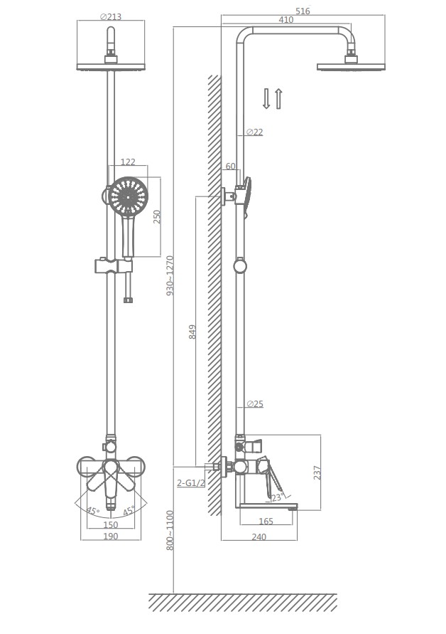 Смеситель, эксцентрики-2шт, декоративная шайба (отражатель)-2шт, штанга, крепление для штанги, кронштейн для верхнего душа, шланг душевой, лейка душевая, держатель душевой лейки, паспорт