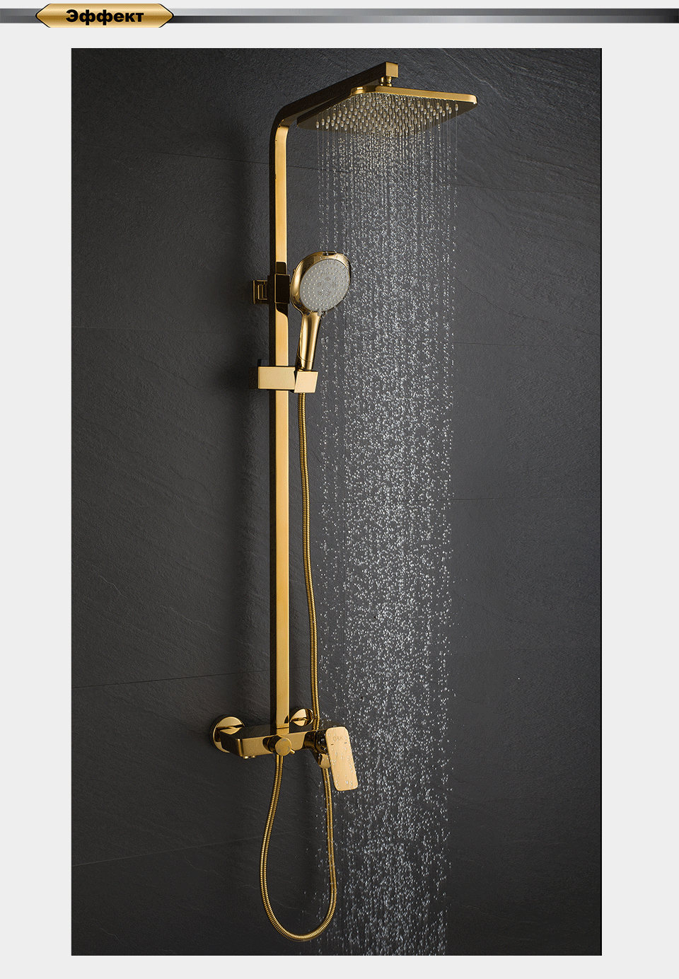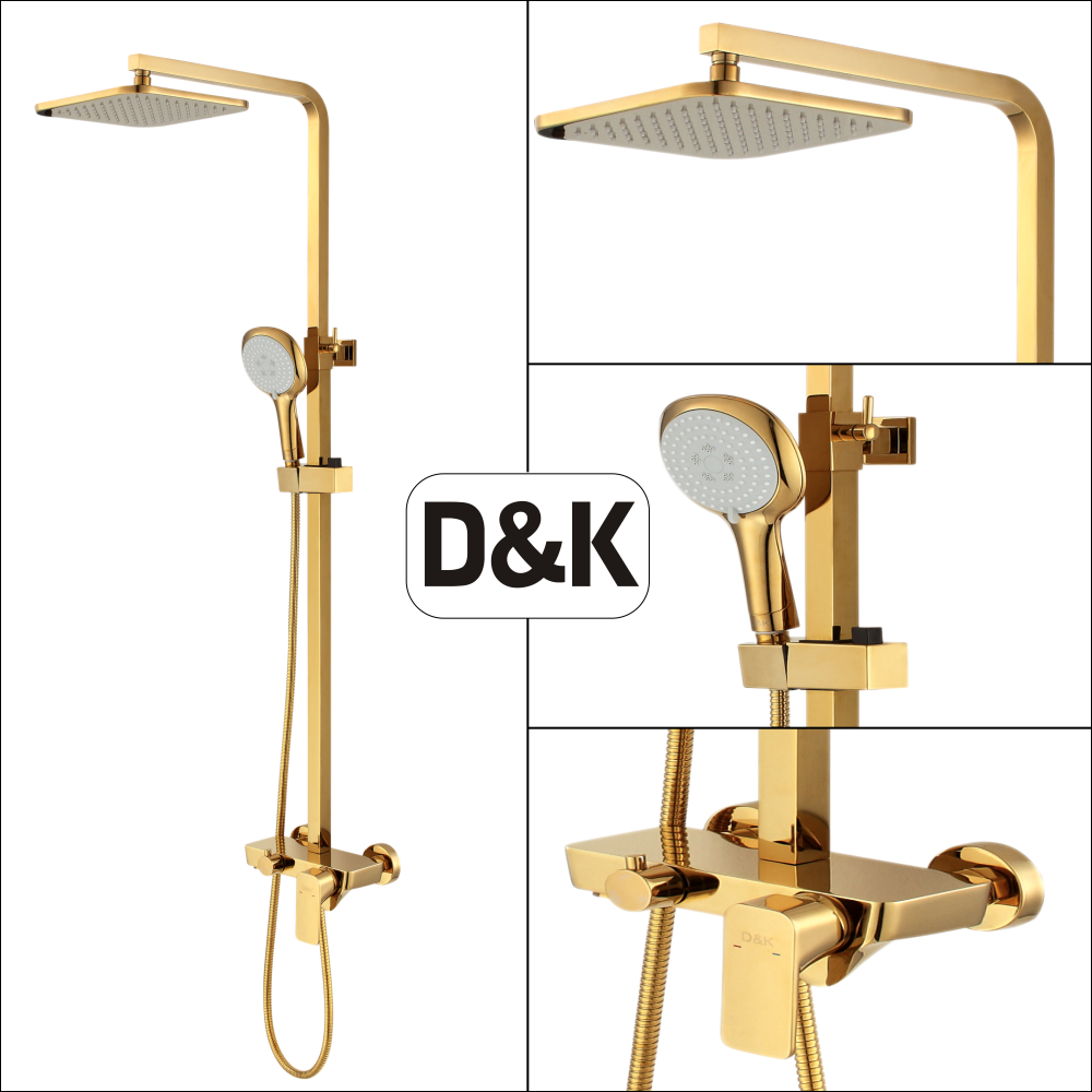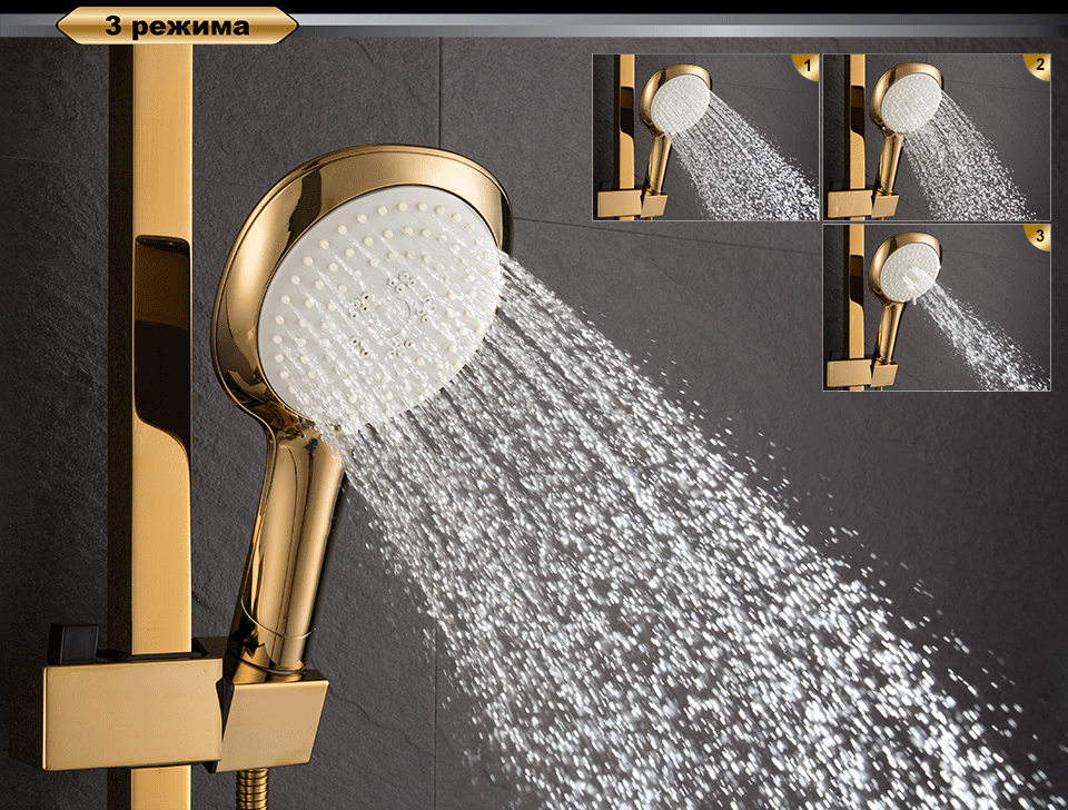 Функциональная душевая система в богатом золотом цвете с широкой лейкой, с эффектом настоящего тропического ливня. Штанга регулируется под любой рост.
