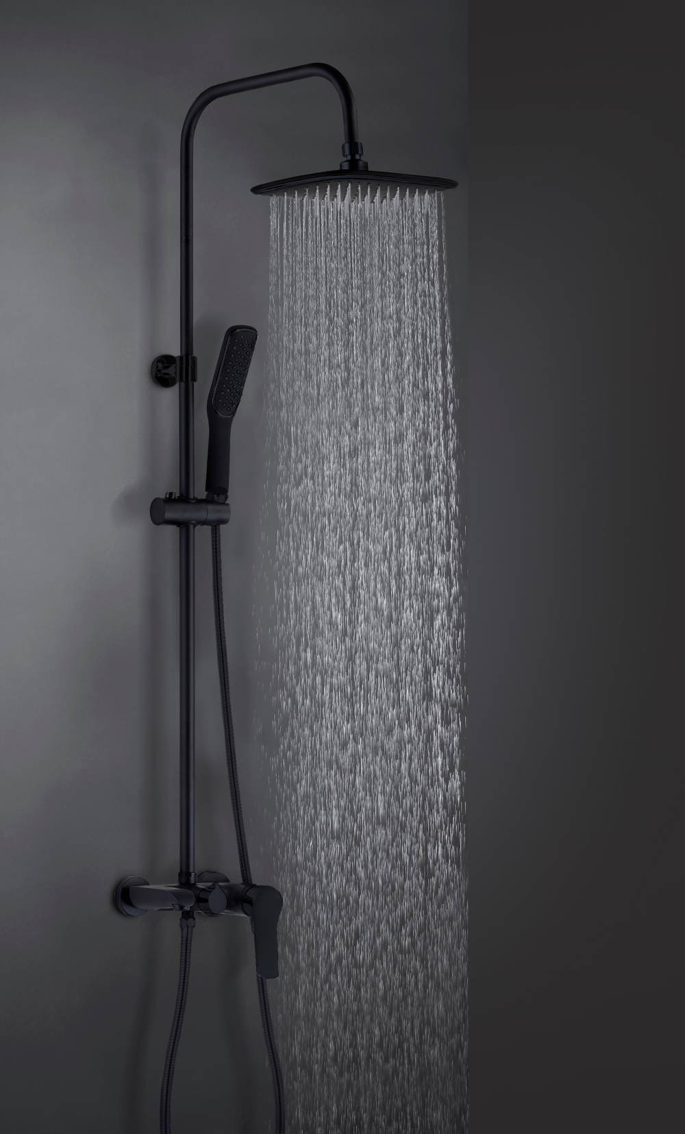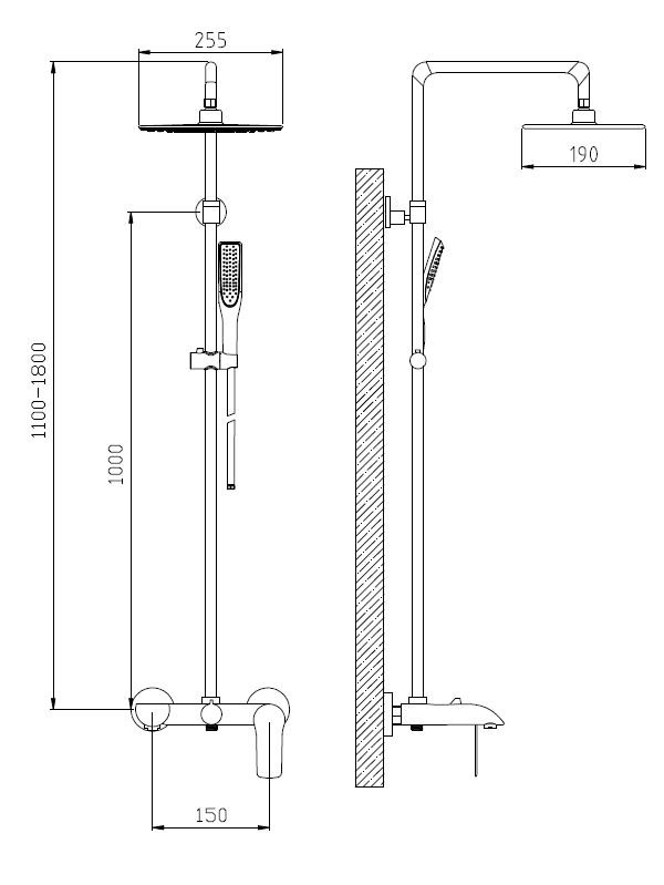 Выдвижная телескопическая стойка(нерж. сталь, хром, черный матовый): высота функциональная 1100 -1300мм , диаметр 22мм ,вылет верхнего душа 400мм ,держатель лейки плавающий FightFix Лейка верхнего душа(ABS-пластик,хром,матовый черный) : на подвижном шарнире, 225Х190мм, Форсунки Self-Clean Device, Eco system Ручная лейка: диаметр 55Х245, 1 режим, Форсунки Self-Clean Device, Eco system Смеситель с изливом(цвет "черный матовый" + хром): картридж ESKO 35мм , трехконтурный переключатель (излив-ручной душ - верхний душ), вылет излива 200мм , Комплектация: душевой шланг 150см (в мет. оплетке, цвет черный, FreeRotation) , монтажный комплект