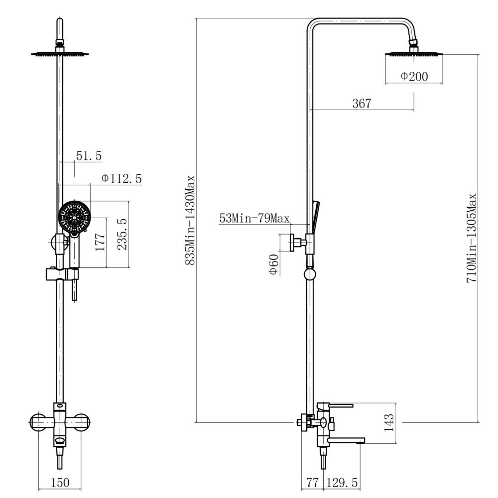 штанга: сталь SUS304, сатин, H=710-1305 мм
