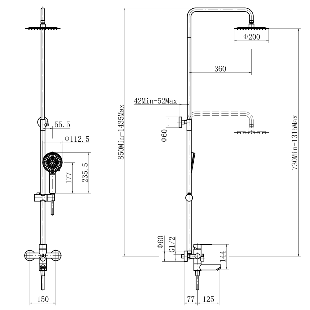 штанга: сталь SUS304, сатин, H=750-1135 мм