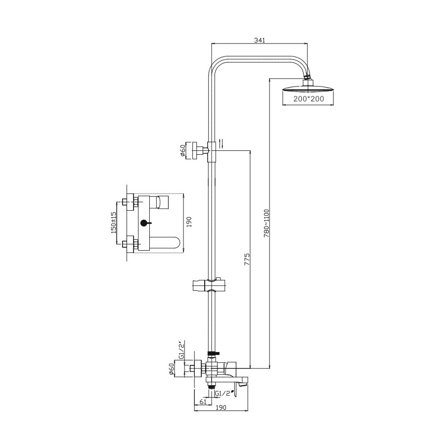 верхний душ, душевая штанга с держателем лейки, ручной душ, смеситель, шланг