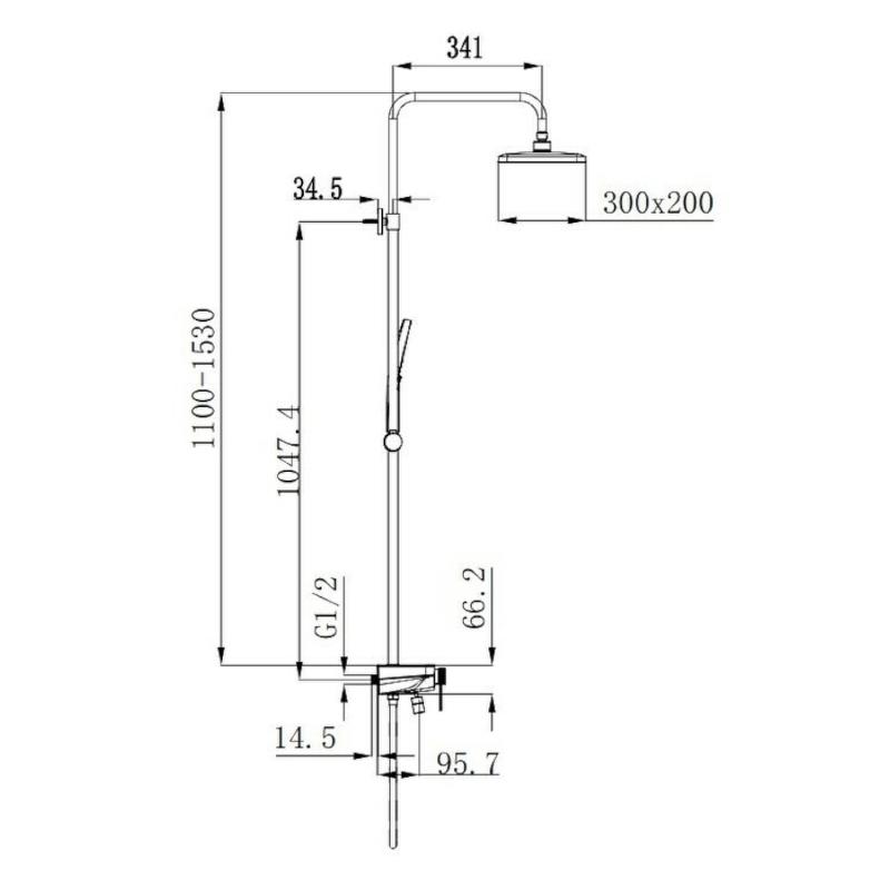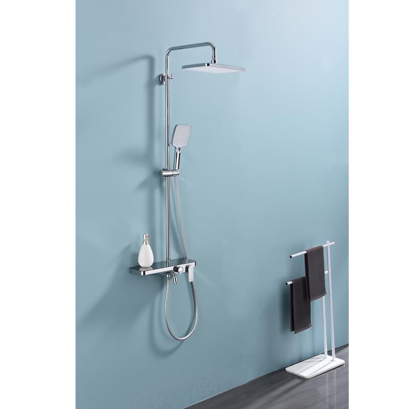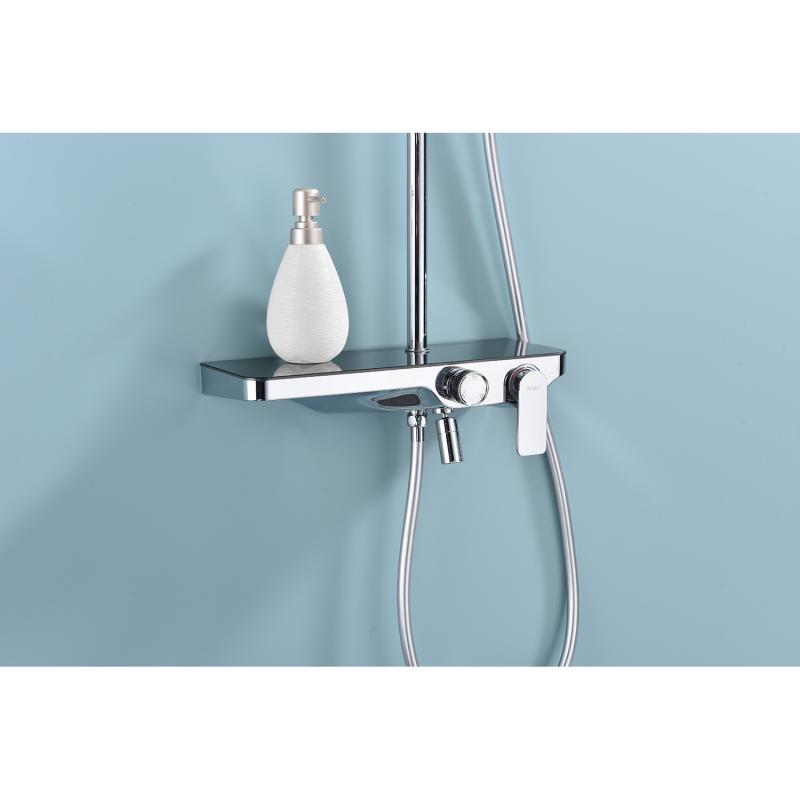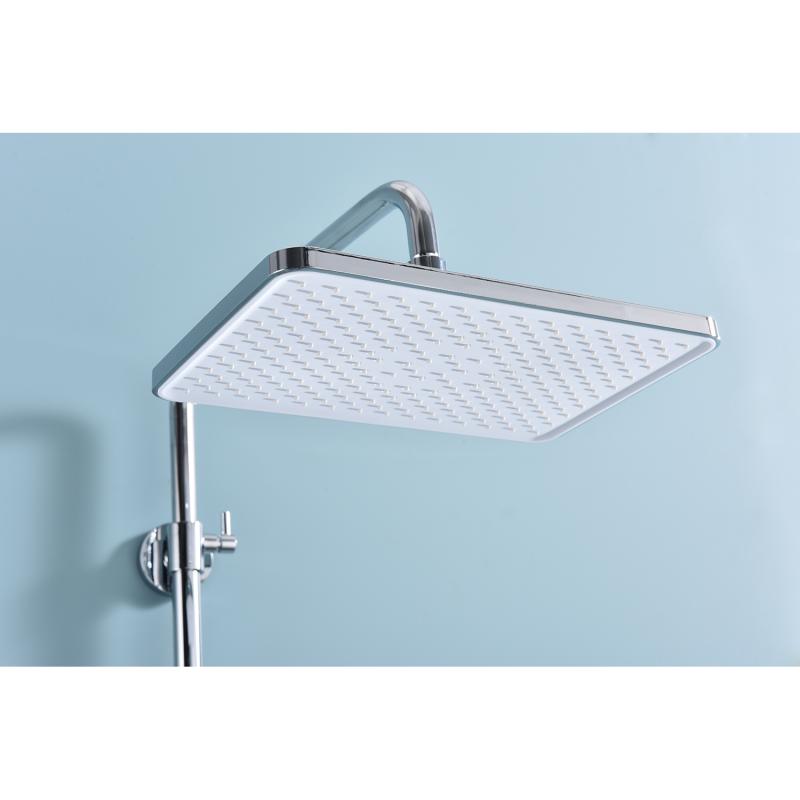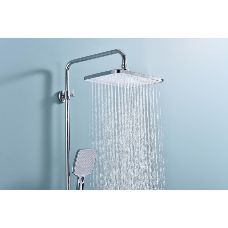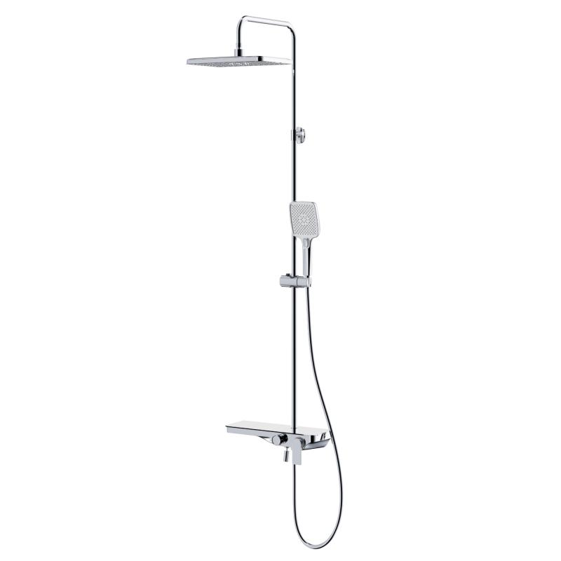 - Комплектация: верхний душ, душевая штанга с держателем лейки, ручной душ, смеситель, шланг, металлический шланг