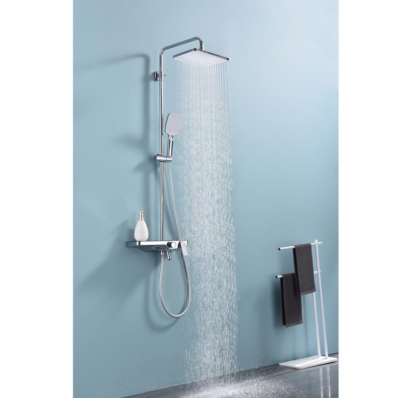 Душевая система Raglo R60.24. Цвет: хром. Материал: латунь. Управление: однорычажное. Механизм: керамический картридж. Скрытый излив с аэратором. Полка из стекла. Регулируемая по высоте душевая штанга: 1100-1530 мм. Форма верхнего душа: прямоугольная. Размер верхнего душа (ШхД): 300х200 мм. Регулируемый по высоте держатель ручного душа. Количество режимов струи ручного душа: 3. Переключение режимов ручного душа: кнопочное. Отверстия для монтажа: 3. Стандарт подводки: G 1/2. Монтаж: на стену.
