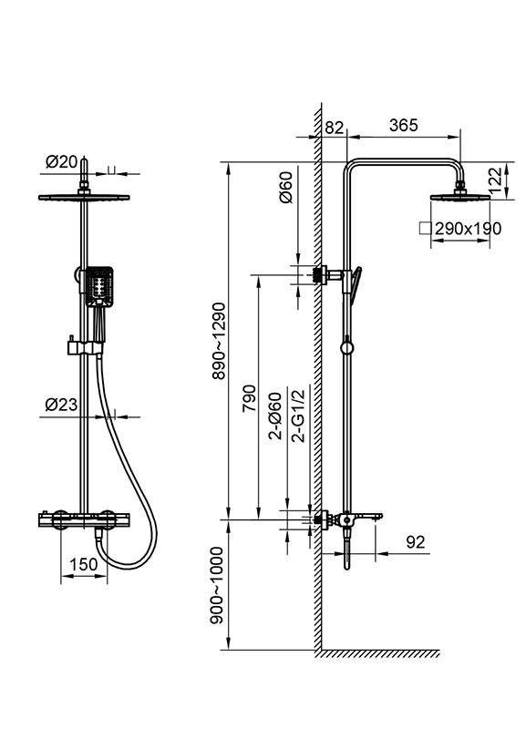 - Комплектация: термостатический смеситель, телескопическая штанга с держателем для ручного душа, ручной душ, гибкий полимерный шланг, верхний душ, аэратор, эксцентрики, декоративные чаши