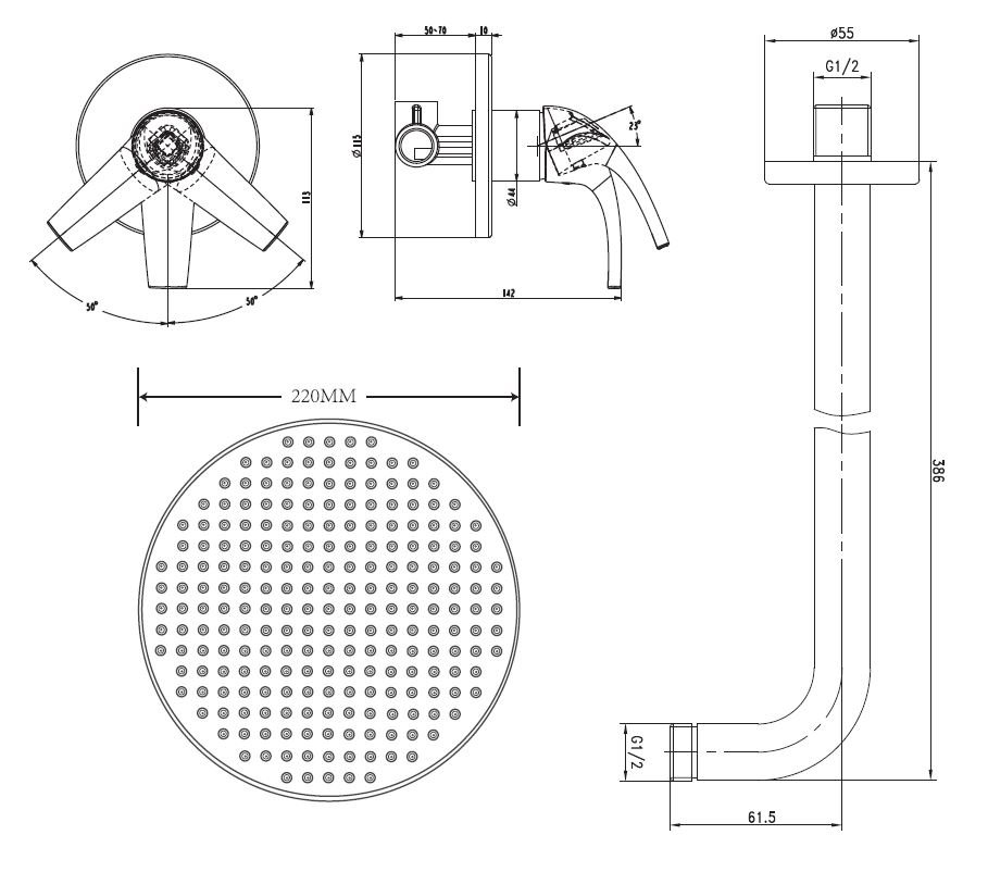 Готовое решение! В набор входит: Смеситель скрытого монтажа: корпус - латунь кат. A, картридж универсальный ESKO- 35мм, "ушки" для монтажа, отражатель с прокладками и монтажный комплект Держатель верхнего душа с отводом: длина 300мм, нерж.сталь/хром Лейка верхнего душа: диаметр 226мм, на подвижном шарнире, материал - ABS пластик/хром,Форсунки Self-Clean Device, Eco system