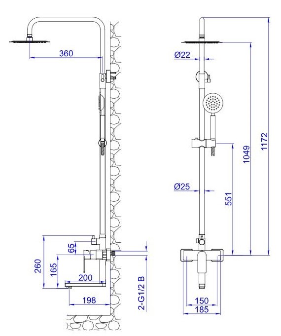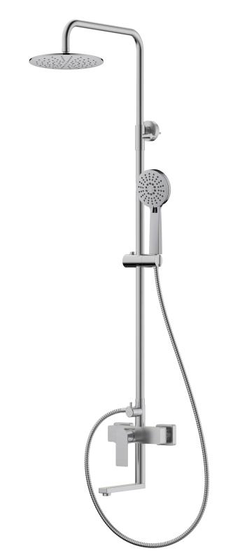 Выдвижная телескопическая стойка (нерж. сталь, покрытие хром): высота стойки 1172 мм, диаметр 25 мм ,вылет верхнего душа 360 мм , высота функциональная 1049 мм, держатель лейки плавающий FightFix. Лейка верхнего душа (ABSпластик): на подвижном шарнире. Ручная лейка: с 3 режимами. Смеситель из нержавеющей стали с поворотным изливом: керамический картридж и дивертор, поворотный излив с вылетом 198 мм. Комплектация: душевой шланг 150 см (в армированной ПВХ оплетке), монтажный комплект