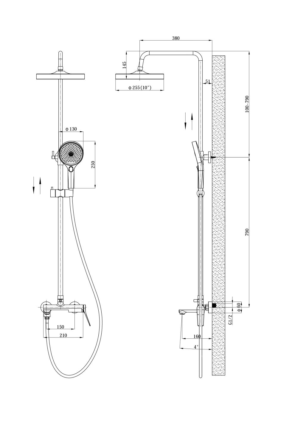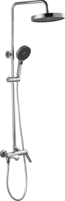 Выдвижная телескопическая стойка(нерж. сталь в хроме): высота функциональная 890 -1580мм, вылет верхнего душа 380мм ,держатель ручной лейки плавающий FightFix Лейка верхнего душа(ABS-пластик,хром) : на подвижном шарнире, диаметр 255мм, Форсунки Self-Clean Device, Eco system Ручная лейка: диаметр 130мм, 3 режима,переключатель - кнопка, Форсунки Self-Clean Device, Eco system Cмеситель латунный с поворотным изливом: картридж универсальный 35мм , переключатель отдельный двуххконтурный (ручной душ - верхний душ), выдвижной излив служит дивертором. Вылет излива 160мм, наклон аэратора 4 гр. Комплектация: душевой шланг 150см (в металл. оплетке), монтажный комплект