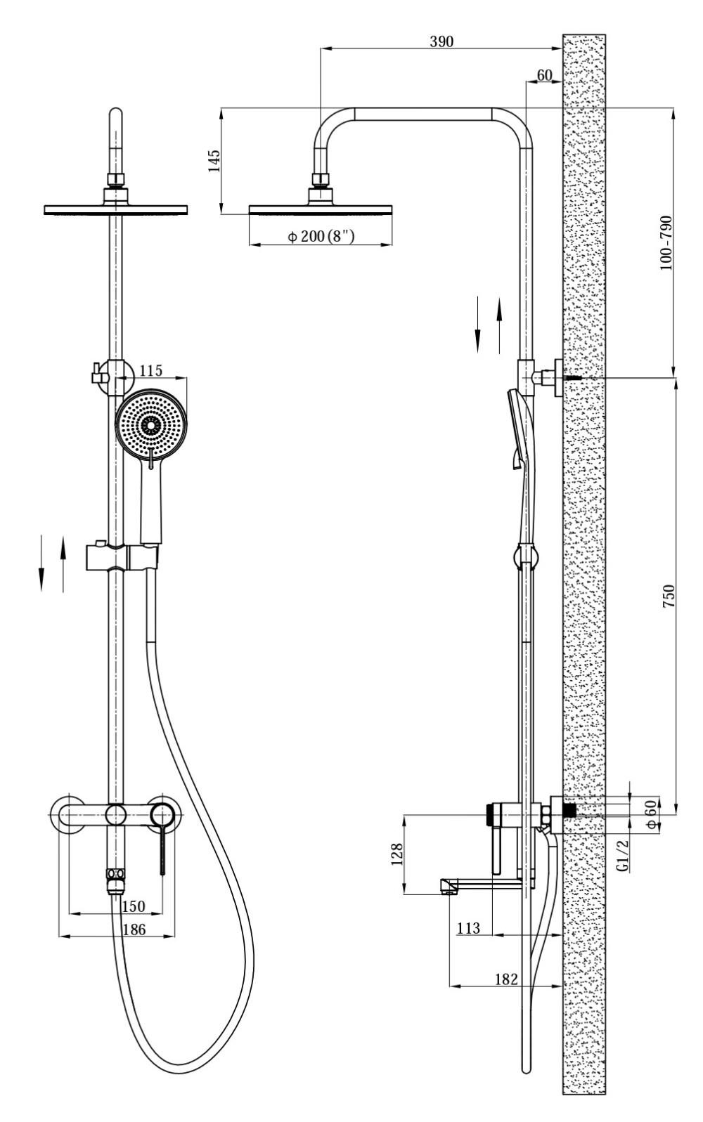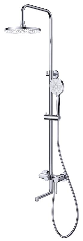 Душевая система со смесителем. Верхний душ диаметром 200мм. Регулируемая высота штанги 850-1540мм. Трехрежимная ручная лейка диаметром 115мм. Смеситель с изливом 182мм. Трехпозиционный дивертор не зависящий от давления воды. В комплекте: душевой шланг 1,5м, монтажный комплект.