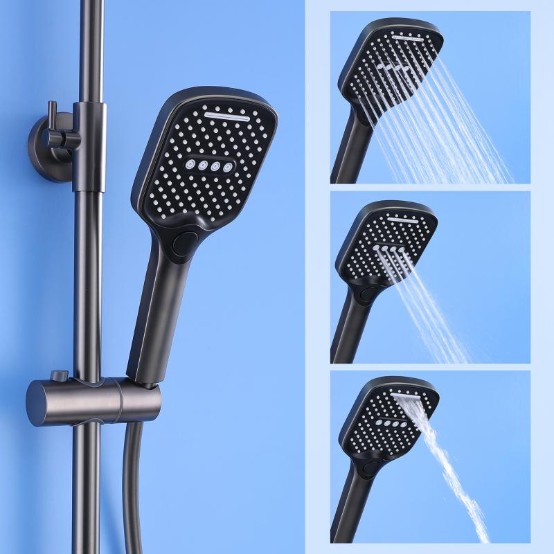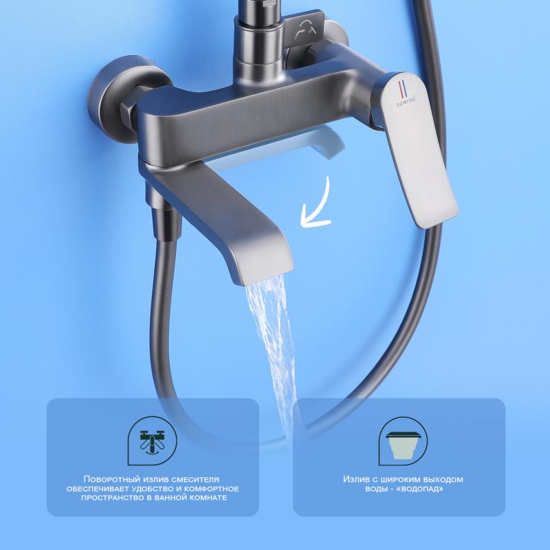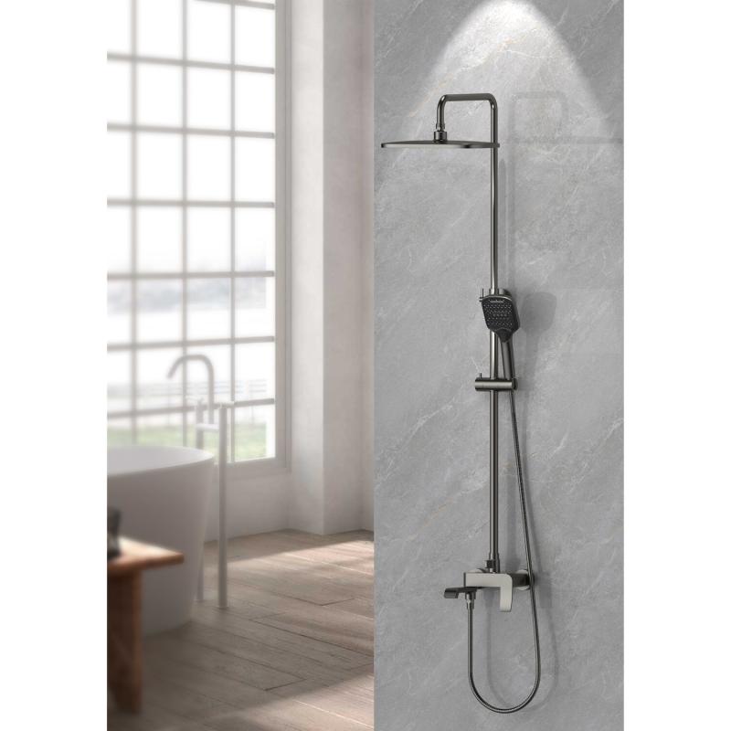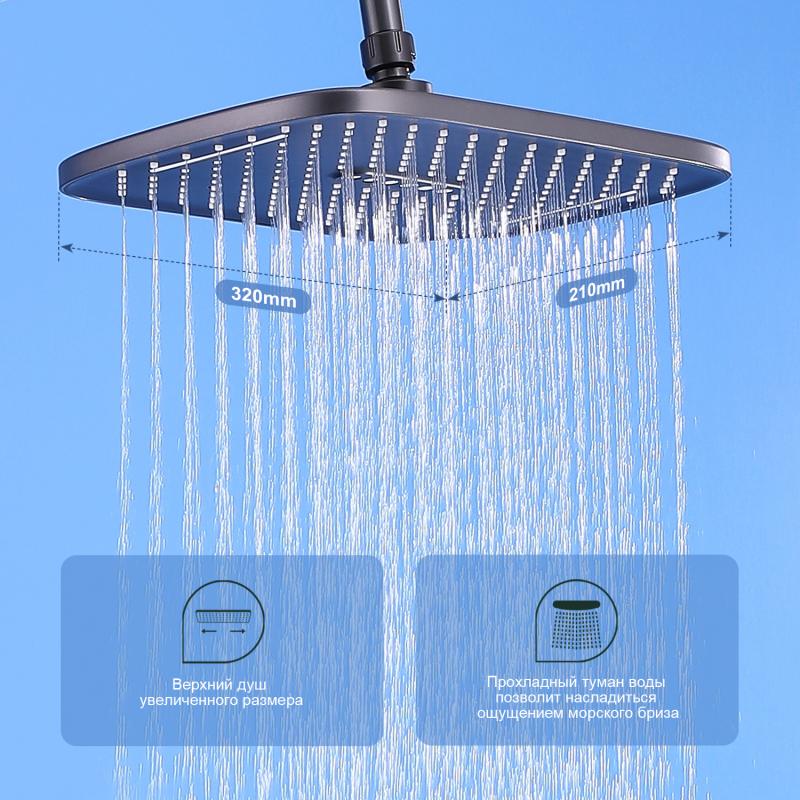 Душевая система Splenka S31.24.09. Цвет: графит. Материал: латунь. Управление: однорычажное. Механизм: керамический картридж. Излив: поворотный. Тип излива: каскадный. Аэратор. Стандарт подводки: G 1/2. Форма верхнего душа: прямоугольная. Размер верхнего душа (ШхД): 320х210 мм. Количество режимов струи ручного душа: 3. Переключение режимов ручного душа: кнопочное. Регулируемая душевая штанга. Регулируемый по высоте держатель ручного душа. Монтаж: на стену. Излив - функция переключения.