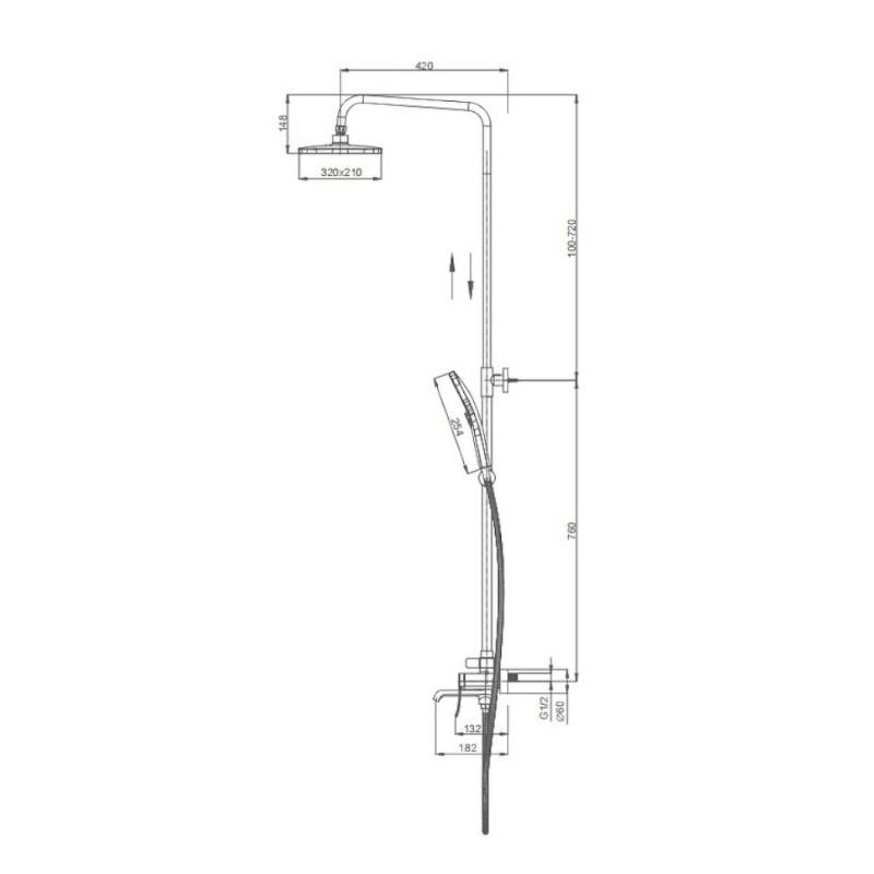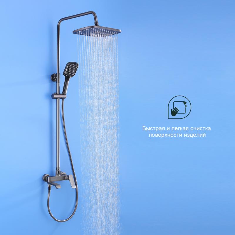 - Комплектация: верхний душ, душевая штанга с держателем лейки, ручной душ, смеситель, шланг, ПВХ шланг