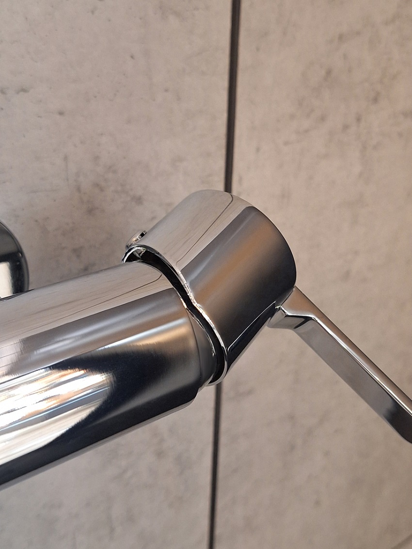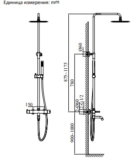 - Комплектация: смеситель настенного монтажа, телескопическая штанга с держателем для ручного душа, ручной душ, гибкий полимерный шланг, верхний душ, аэратор, эксцентрики, чаши декоративные
