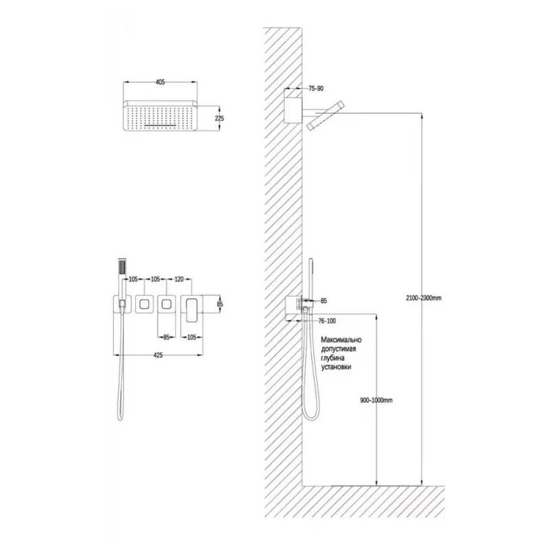 Верхний тропический душ 40,5х22,5 см ,прямоугольник с двумя режимами