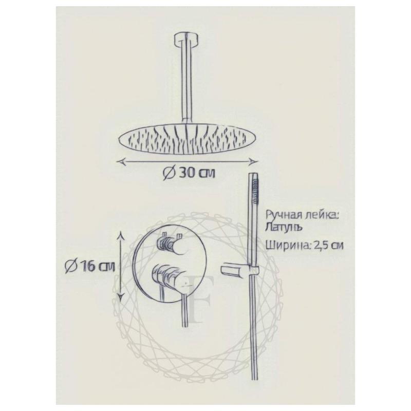 Комплектация: смеситель, внутренняя часть, шланговое подключение с держателем лейки, душевой шланг, верхний душ с кронштейном