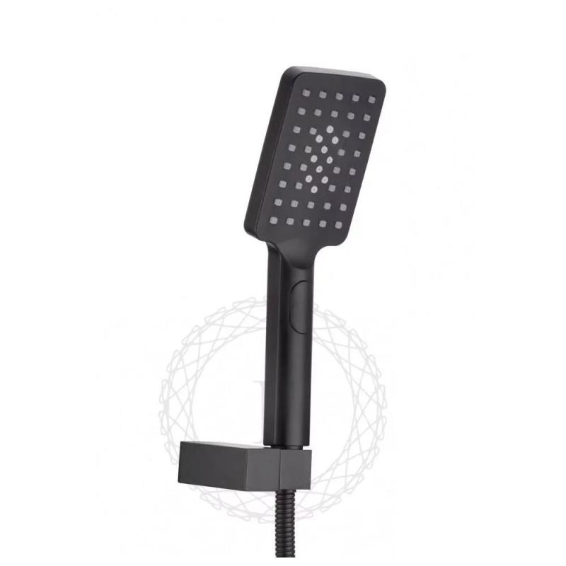 Комплектация: смеситель, внутренняя часть, шланговое подключение с изливом, держатель душевой лейки, лейка, душевой шланг, верхний душ с кронштейном