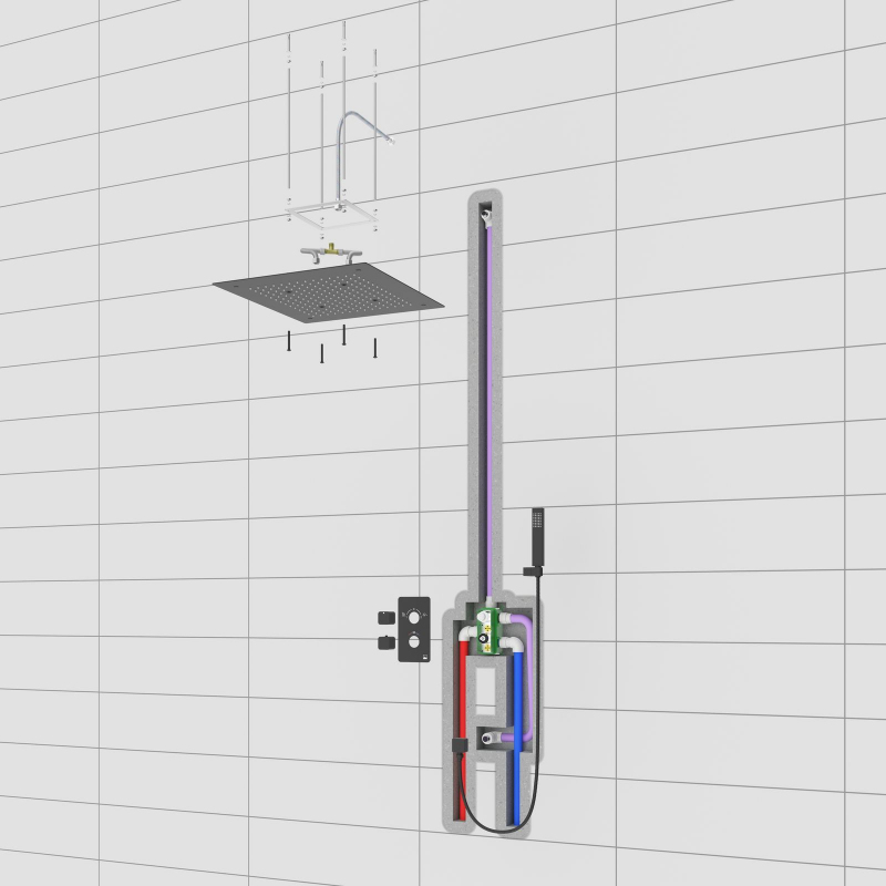 Душевая система с термостатом Timo Petruma 5029 относится к премиальному сегменту, предназначена для монтажа в полой или твердой стене. Термостатический картридж поддерживает стабильную температуру воды, обеспечивая максимально комфортные условия для принятия водных процедур. Встроенный потолочный душ большого размера создает имитацию проливного дождя, вода обливает человека целиком. Регулируя напор воды можно получить массажное воздействие, что очень полезно для здоровья. Основные преимущества встроенной системы: элегантный внешний вид, все коммуникации и крепления спрятаны в стену и потолок, снаружи видны только декоративные элементы. Установить встроенную систему можно в любом месте. Использовать такой смеситель очень удобно, регулировка температуры воды осуществляется ручкой термостата (расположена снизу). Режим "тропический душ" и увеличение напора осуществляется поворотом ручки дивертора (расположена сверху) влево. Для переключения в режим "ручной душ" верните ручку дивертора в исходное положение 12:00 (смеситель выключен), а затем поверните вправо. Увеличение напора воды осуществляется поворотом ручки вправо. Сложностей монтажа не возникает при установке элементов душевой системы опытным сантехником. Внимательно изучите инструкцию по монтажу и эксплуатации.