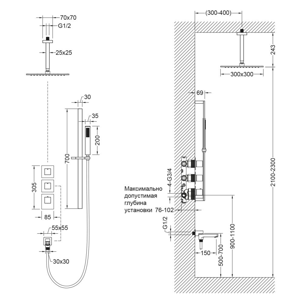 Душевая система с термостатом Selene 2239 относится к премиальному сегменту, предназначена для монтажа в полой или твердой стене. Верхний душ с вертикальным потолочным креплением выполнен из латуни. Термостатический картридж поддерживает стабильную температуру воды, обеспечивая максимально комфортные условия для принятия водных процедур. Регулируя напор воды в режиме "тропический душ" можно получить массажное воздействие различной интенсивности. Основные преимущества встроенной системы: элегантный внешний вид, все коммуникации и крепления спрятаны в стену, снаружи видны только декоративные элементы. Установить встроенную систему можно в любом месте. Использовать такой смеситель очень удобно, стильная стойка из латуни позволяет установить ручную лейку-карандаш на необходимую высоту. Регулировка температуры воды осуществляется ручкой термостата (расположена снизу). Включение режима "тропический душ" и регулировка напора осуществляется поворотом ручки дивертора (расположена сверху) влево. В положении ручки дивертора 12:00 режим "тропический душ" выключен. Для переключения в режим "излив" поверните ручку дивертора (расположена по центру) от 12:00 против часовой стрелки. Увеличение напора воды регулируется поворотом ручки влево. Для переключения потока воды с излива на ручной душ, поверните излив к стене. В положении ручки 12:00 режим "излив" выключен. Сложностей монтажа не возникает при установке элементов душевой системы опытным сантехником. Внимательно изучите инструкцию по монтажу и эксплуатации.
