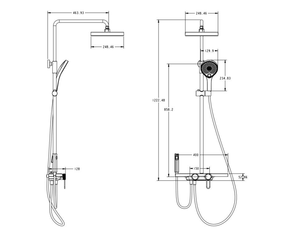 Представляем вашему вниманию элегантный и функциональный смеситель для ванны KABRERA на 4 потока, который станет украшением вашей ванной комнаты и подарит незабываемые ощущения комфорта. Смеситель для ванны включает в себя: - Верхний душ диаметром 248,46 мм: широкий поток воды из большого количества форсунок обеспечит вам полноценное наслаждение и приятный расслабляющий эффект. Специальное покрытие форсунок предотвращает образование известкового налета, продлевая срок службы изделия. - Ручной душ с переключателем режимов: эргономичная ручка и удобное крепление обеспечивают комфортное использование. Благодаря переключателю, вы можете выбрать наиболее подходящий режим струи — от мягкого до интенсивного. Размер лейки составляет 129,9 мм. - Компактную и и функциональную гигиеническую лейку, которая обеспечивает дополнительный комфорт и гигиену. - Удобную полочку: стильная и практичная полочка, позволит удобно разместить необходимые принадлежности, например, шампуни и гели для душа. - Встроенный в полочку смеситель. Смеситель оснащен керамическим картриджем, который гарантирует плавное и точное регулирование температуры и напора воды, обеспечивая долгий срок службы смесителя, а так же керамическим дивертором.