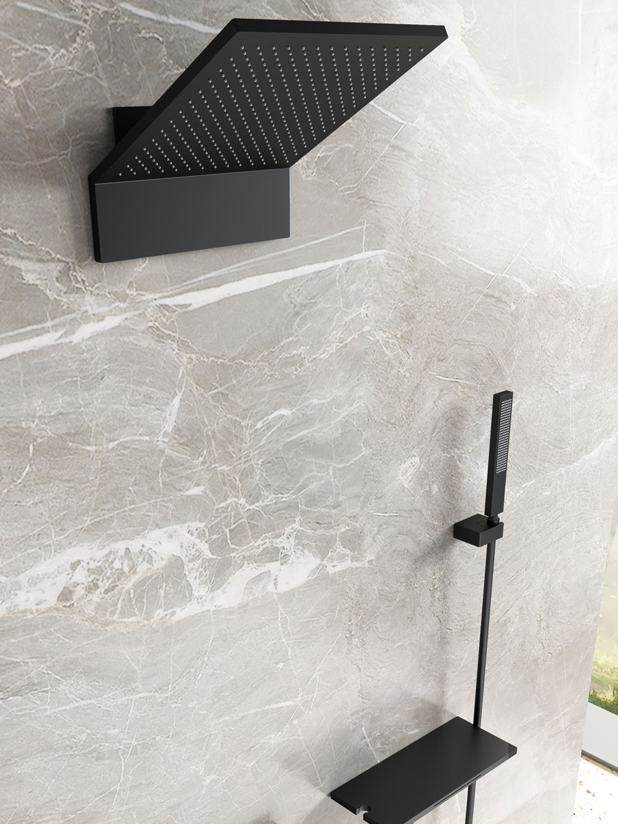 Верхний душ, полка с изливом и держателем ручного душа, ручной душ, смеситель со встраиваемой частью