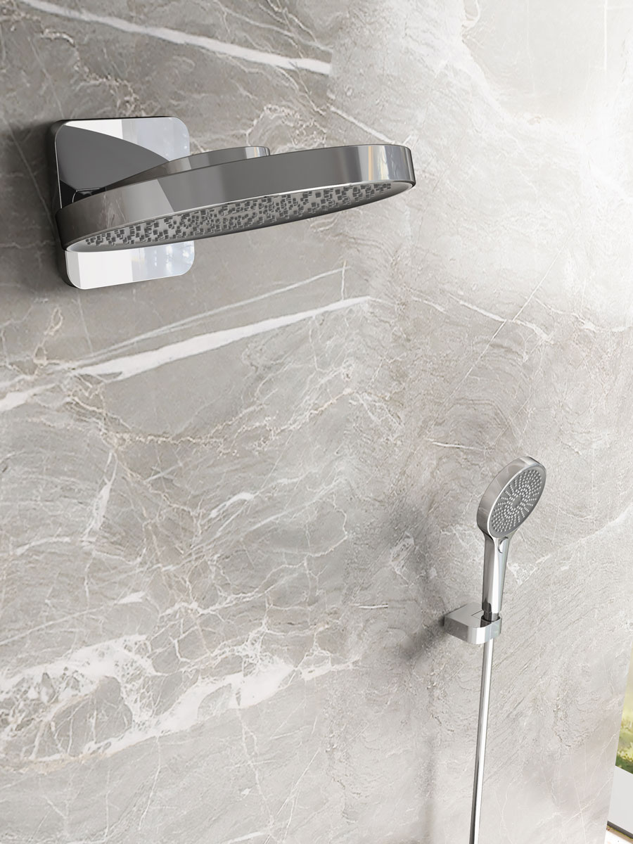 Верхний душ, полка с изливом и держателем ручного душа, ручной душ, смеситель со встраиваемой частью