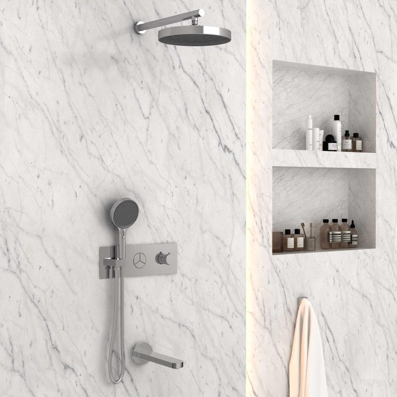 - Состав комплекта: Верхний душ, ручной душ, встраиваемый смеситель, излив