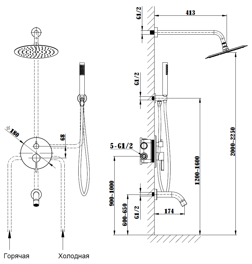 Верхний душ, ручной душ, смеситель со встраиваемой частью, излив