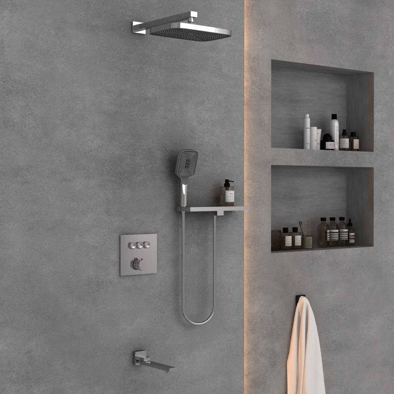 - Состав комплекта: Верхний душ, полка с изливом и держателем ручного душа, ручной душ, смеситель со встраиваемой частью, излив