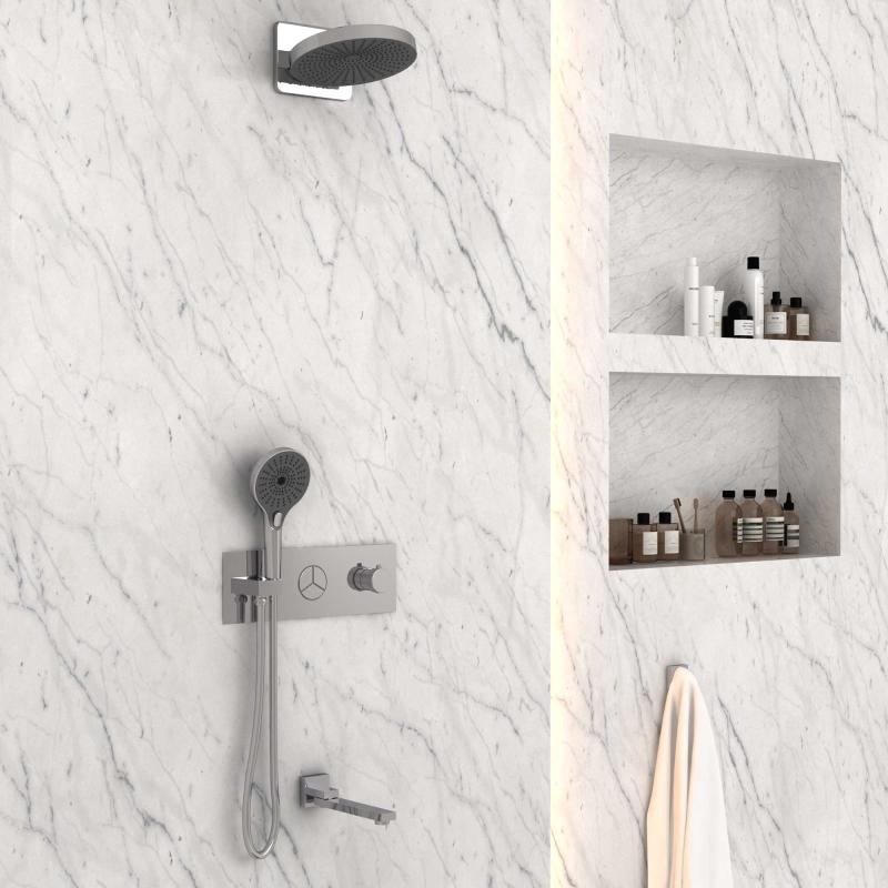 - Состав комплекта: Верхний душ, держатель ручного душа, ручной душ, встраиваемый смеситель,излив
