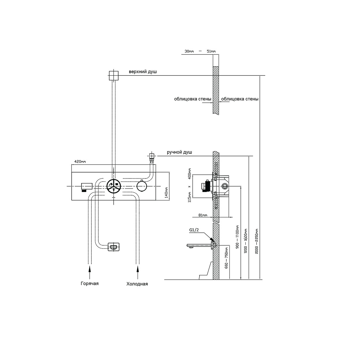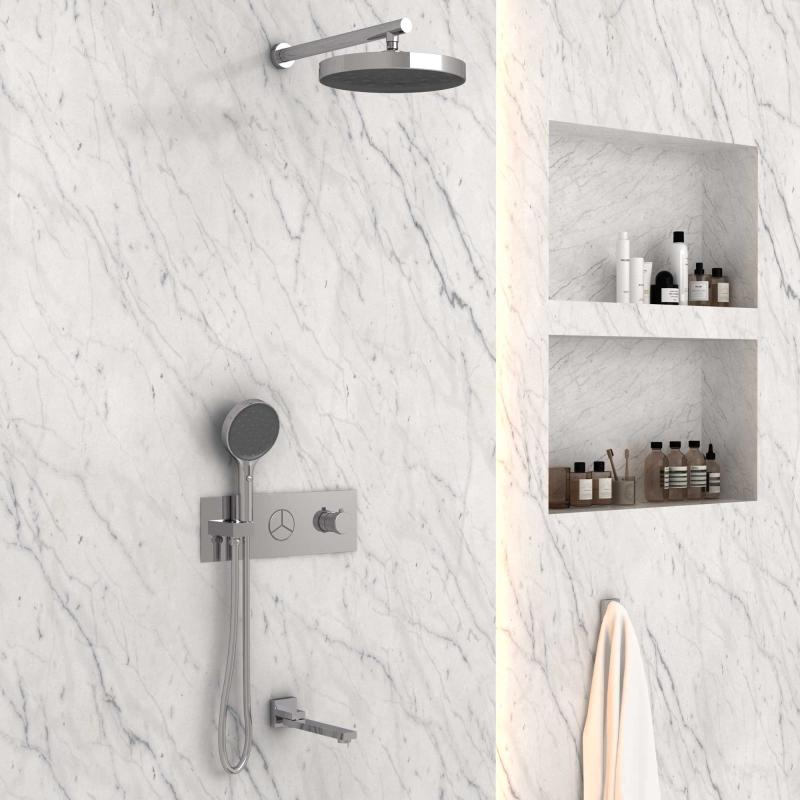 - Состав комплекта: Верхний душ, ручной душ, встраиваемый смеситель, излив