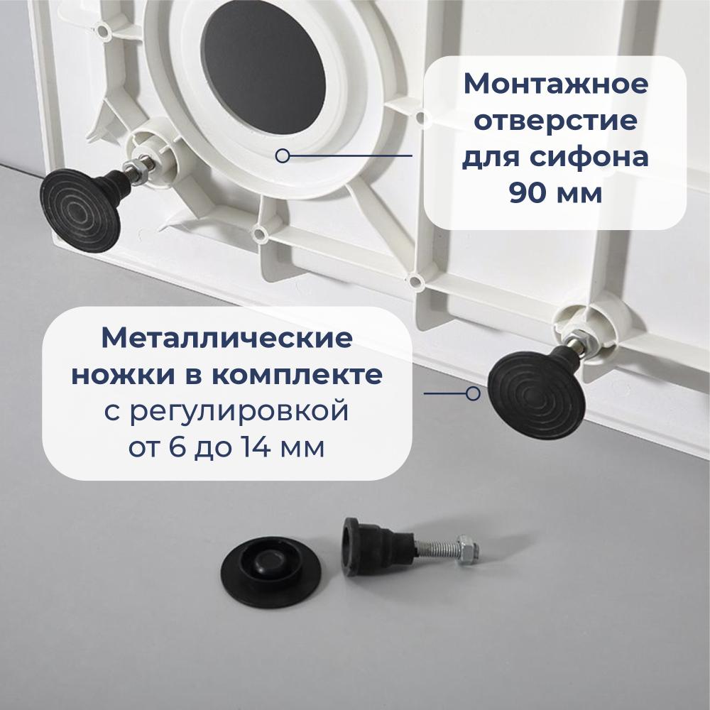 Поддоны оснащены литыми экранами, что позволит скрыть сливную систему, а наличие в комплекте ножек с регулировкой высоты, позволит быстро и легко установить поддон и начать его использовать.