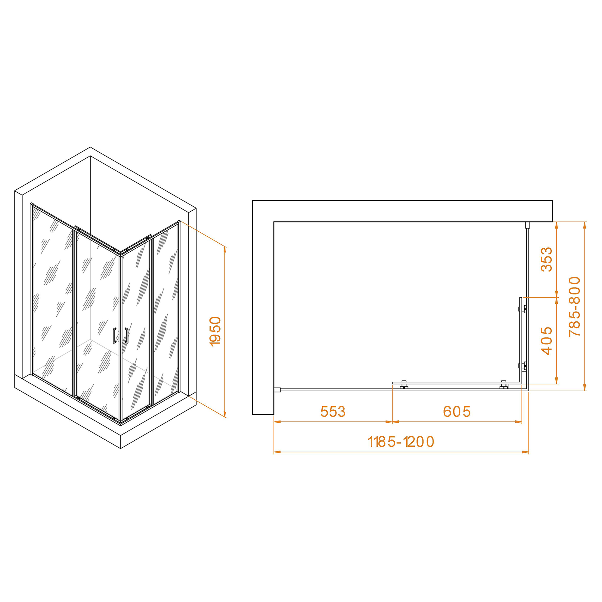 Цвет профиля хром благодаря своей яркости и блеску привносит в интерьер ванной комнаты дополнительную эстетику и шик. Высота душевого угла составляет 1950 мм, что достаточно, чтобы владельцы любого роста могли свободно использовать данную конструкцию.